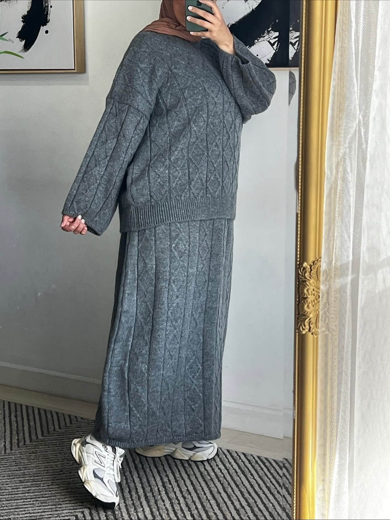 Cet ensemble en maille épaisse à motif torsadé est composé d’un chandail ample et d’une jupe longue, parfait pour un style modeste et raffiné.