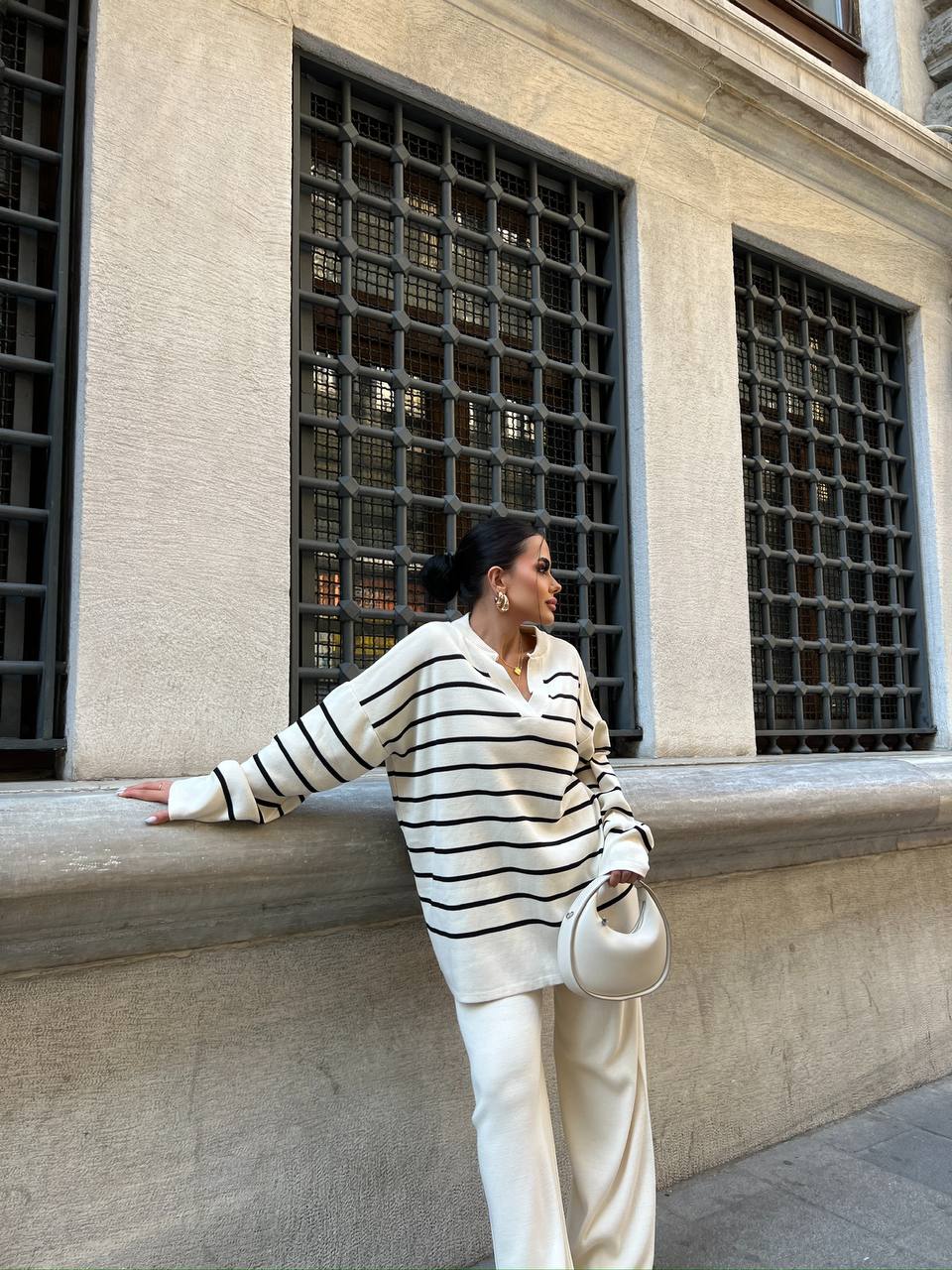 Cet ensemble associe un pull over size rayé à col en V et un pantalon ample dans une teinte neutre. Idéal pour un style casual chic, il offre confort et élégance pour les saisons fraîches .